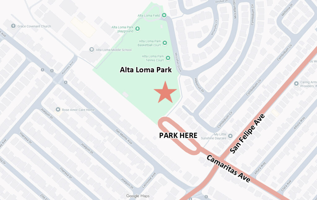 Parking: We recommend parking in the large lot south of Alta Loma Park. Click the map image for a Google Maps link.